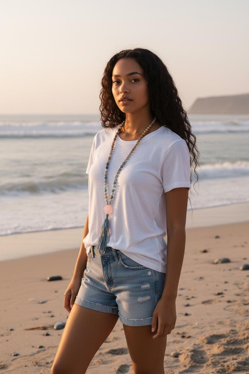 Warm and versatile, this 108 bead Mala is hand-knotted from Sandalwood, matte Amazonite, and matte Picture Jasper, finished with your choice of a large raw Rose Quartz or raw Green Aventurine Guru bead. It is completed with a silk thread tassel, with additional tassel choices available for personalization. Sandalwood is often connected with calm and clarity, Amazonite with balance and peace, Picture Jasper with grounding, Rose Quartz with love, and Green Aventurine with growth and renewal—making this Mala a meaningful and customizable piece for meditation, mindfulness, or everyday wear.
