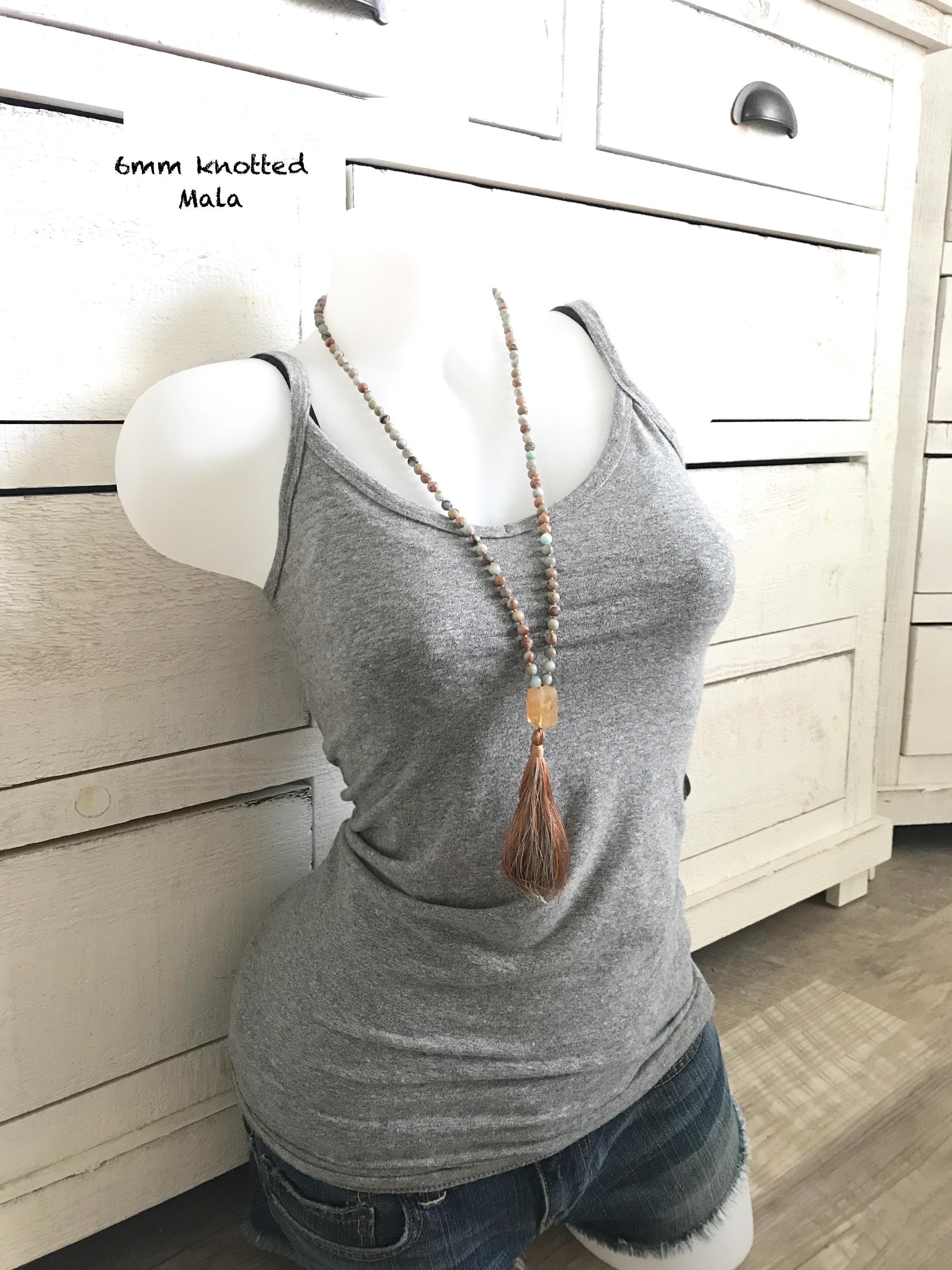 The Mala in these pictures has sold, you will receive a Mala made the same exact way as pictured with materials listed. All natural gemstones beads have their own unique markings and colors, so the Mala you receive will be an original True Nature Jewelry design