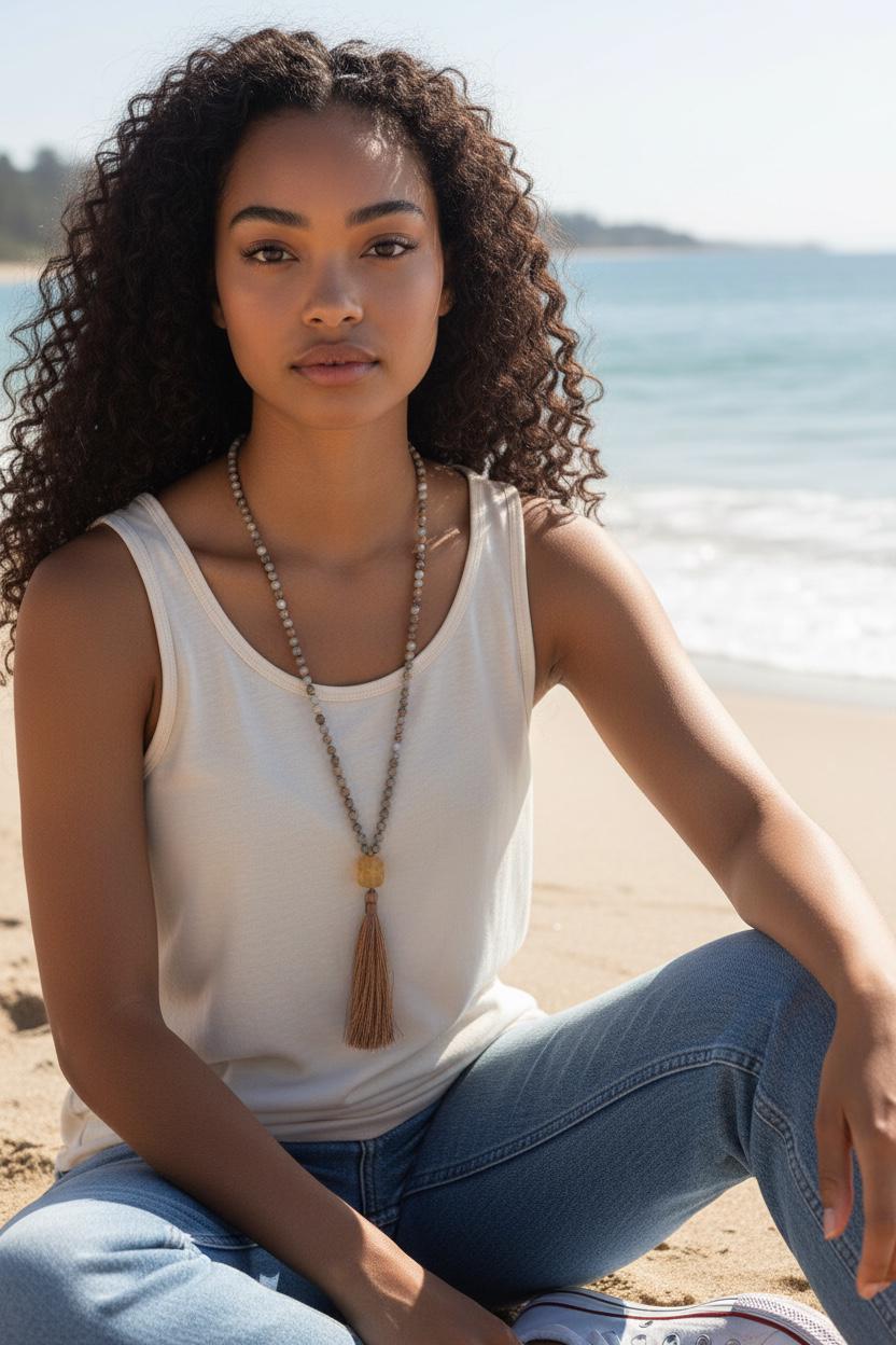 Warm and uplifting, this 108 bead Mala is hand-knotted from African Opal Jasper and finished with a large faceted Citrine Guru bead. It features a unique silk thread tassel with three colors blended together, with additional tassel options available for personalization. African Opal Jasper is often connected with tranquility and balance, while Citrine is associated with joy, clarity, and abundance. This combination makes the Mala a beautiful and meaningful choice for meditation, mindfulness, or as a unique gift for a special person.