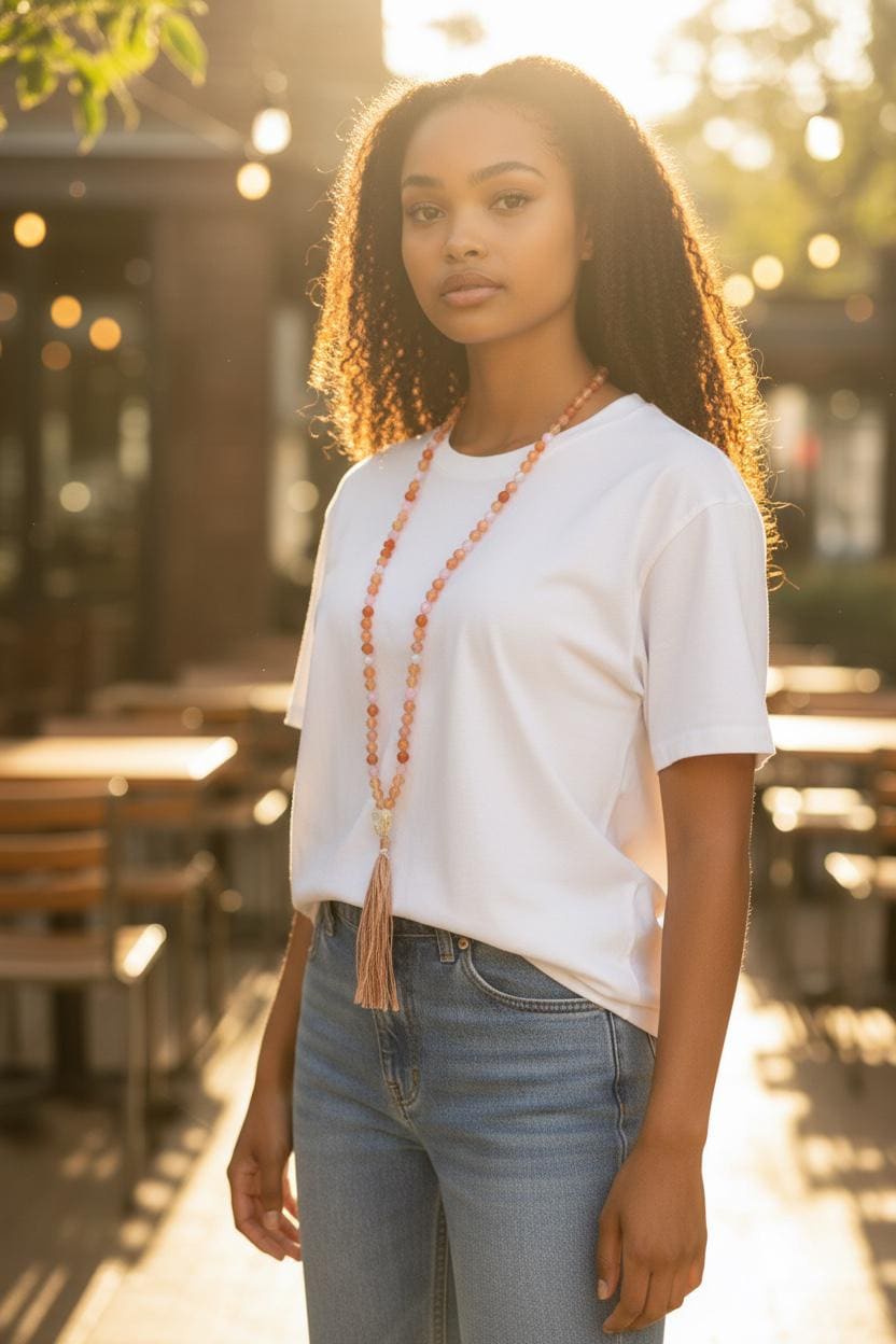 Radiant and uplifting, this 108 bead Mala is hand-knotted from Sunstone, Carnelian, Aquamarine, and Rose Quartz, finished with a large faceted Citrine Guru bead. A silk thread tassel completes the design, with options for other tassels or a no tassel version for on-the-go wear or wrapping around the wrist. Sunstone is often linked with joy and vitality, Carnelian with courage and creativity, Aquamarine with calm and clarity, Rose Quartz with love and compassion, and Citrine with abundance and positivity. This vibrant Mala is a meaningful companion for meditation, mindfulness, or as a unique gift idea.