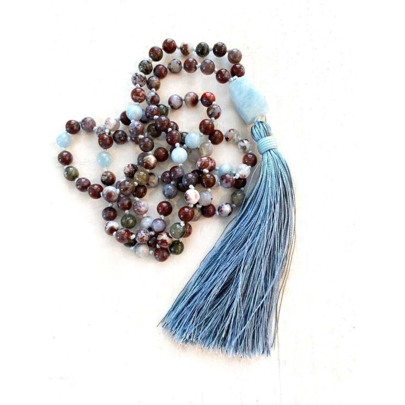 Striking and symbolic, this 108 bead Mala is hand-knotted from Red Lightning Agate and Aquamarine, blending fiery energy with soothing calm. It is finished with a faceted Aquamarine Guru bead and a silk thread tassel woven from both dark and light Blue threads. Other tassel choices are available, including a no tassel option for on-the-go wear or wrapping around the wrist. Each stone carries its own unique energy—Red Lightning Agate is connected with strength, courage, and grounding, while Aquamarine is associated with calm, clarity, and emotional balance. Together, they create a beautiful harmony of energies, making this Mala a meaningful companion for meditation, mindfulness, or as a perfect gift for a special person.