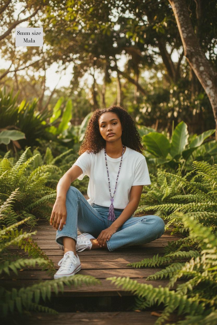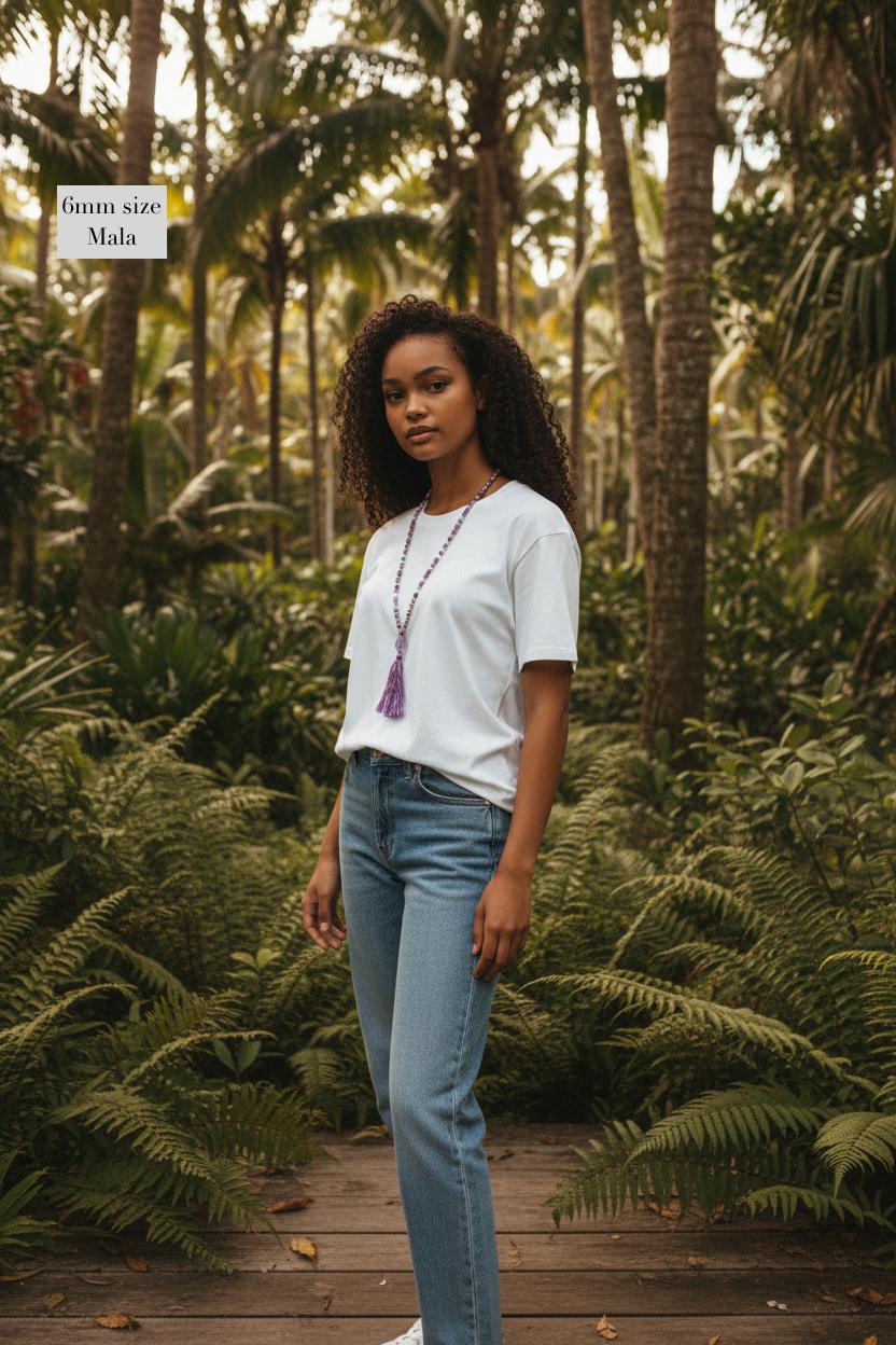 My Malas are available in two sizes: 8mm and 6mm. If you like a lighter or more petite style, the 6mm is a great choice. Each listing shows the Mala on a mannequin and a model so you can get a clear idea of how it looks. If you need guidance, just send me a note—I’m happy to help.