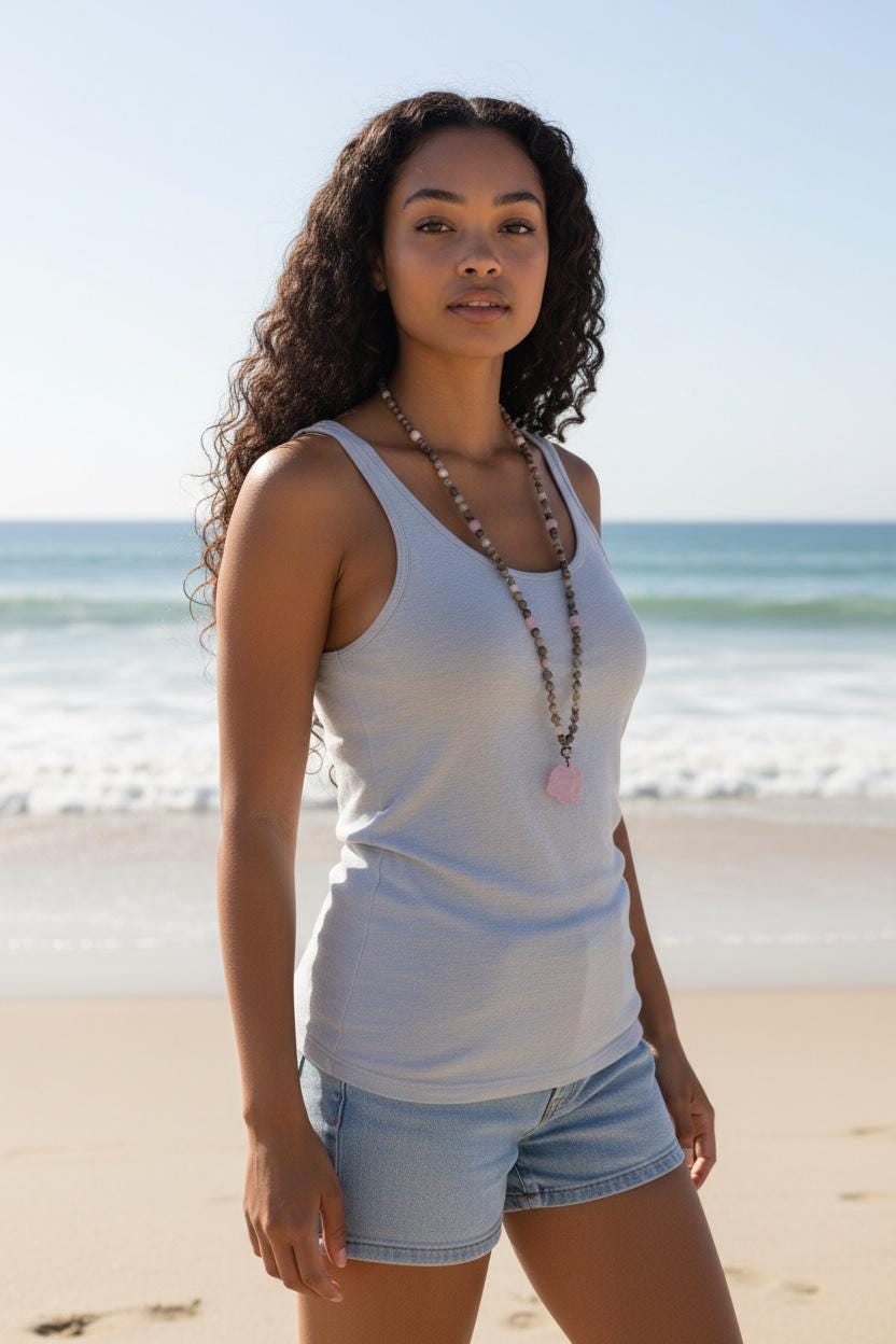 Colorful and expressive, this 108 bead Mala is hand-knotted from Pink Zebra Jasper, Hematite, and Rose Quartz, finished with a large raw Rose Quartz Guru bead. It features a Purple tassel that can be customized with other tassel choices, or it can be made without a tassel for a more durable, on-the-go option. Pink Zebra Jasper is often connected with balance and stability, Hematite with grounding and protection, and Rose Quartz with love and compassion. This blend of stones makes the Mala both vibrant and meaningful, perfect for meditation, mindfulness, or as a unique gift idea.