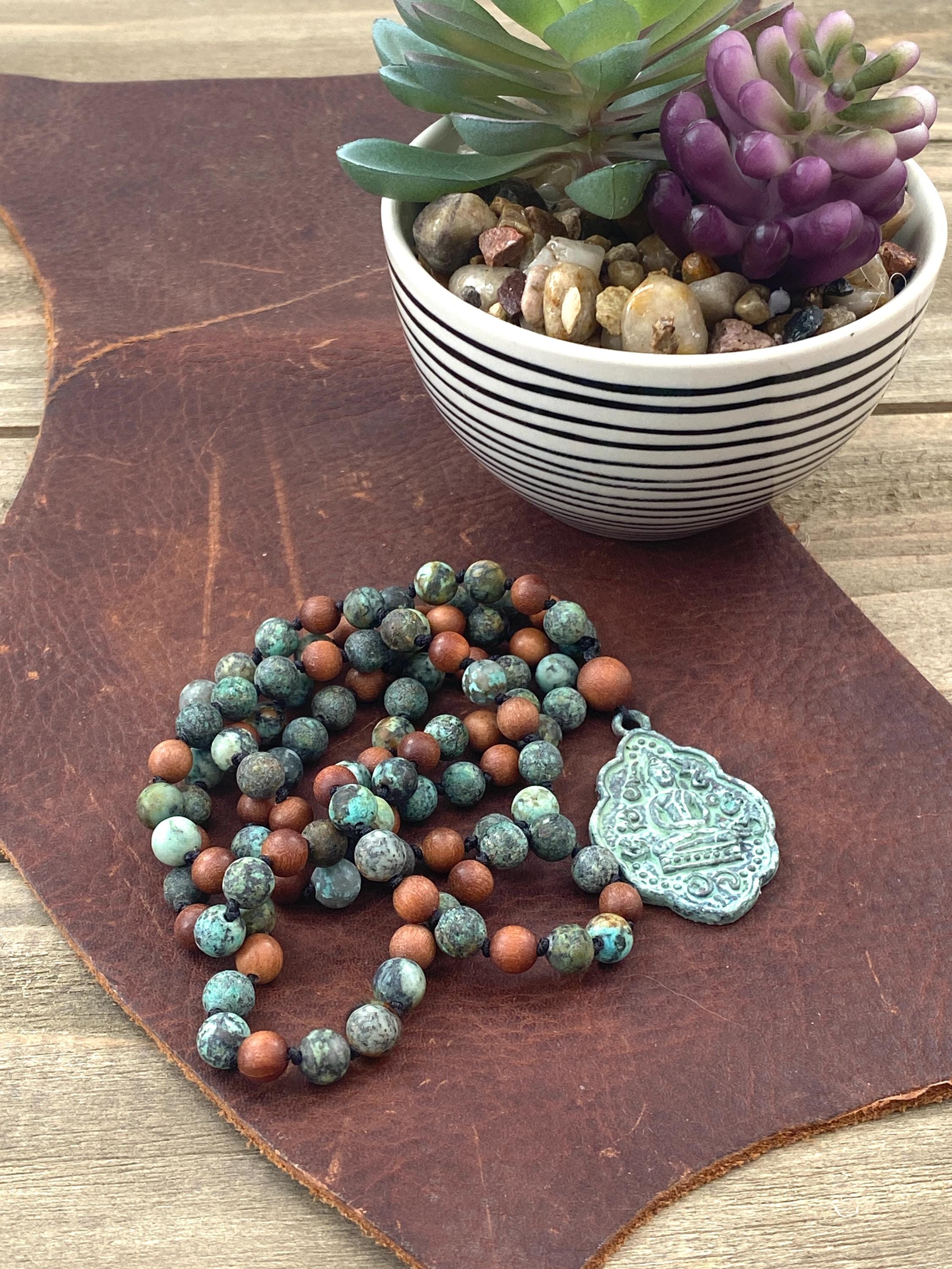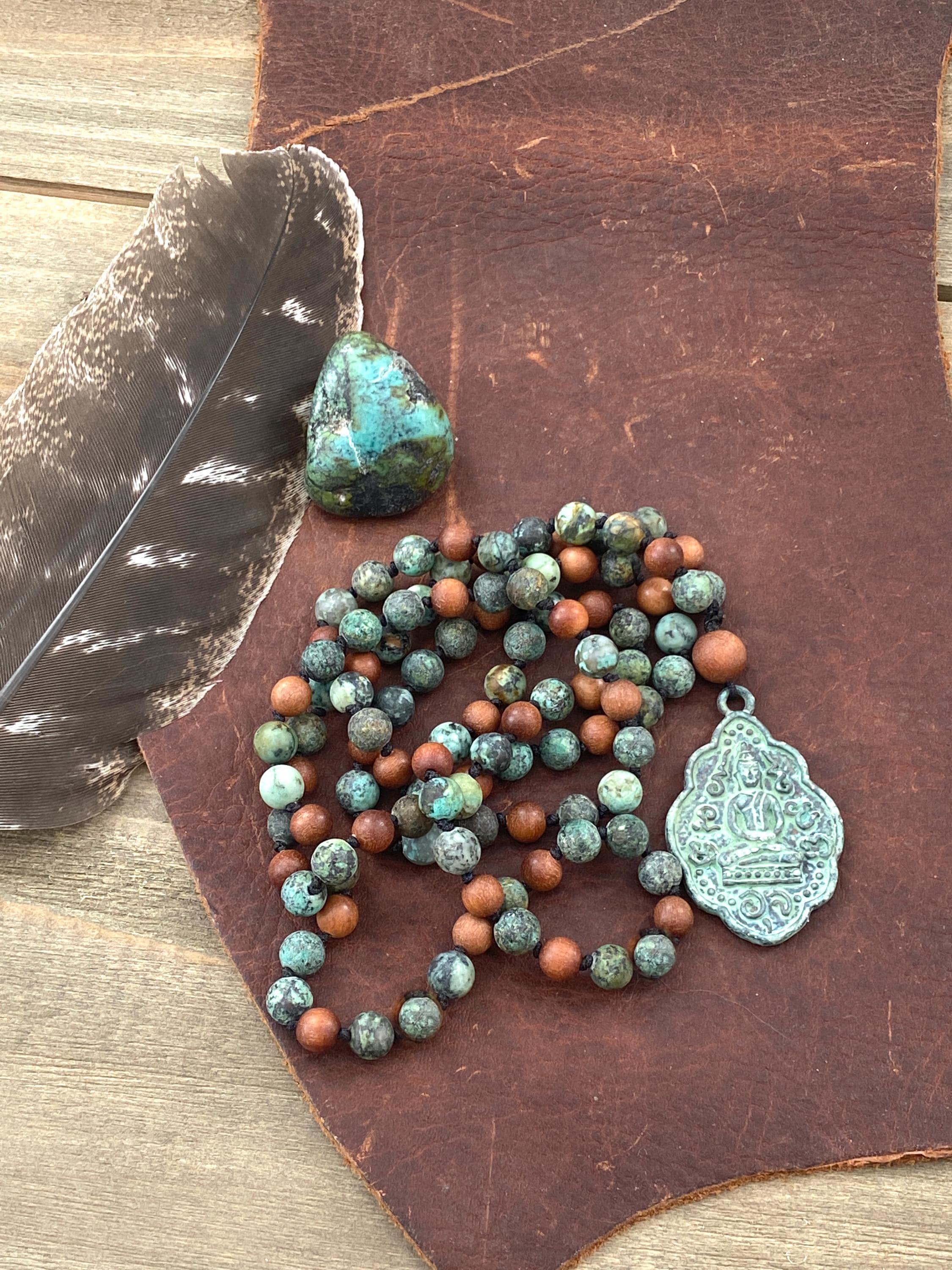 Grounded and timeless, this 108 bead Mala is hand-knotted from matte African Turquoise and Sandalwood, finished with a brass patina Buddha pendant. African Turquoise is often connected with growth, transformation, and inner wisdom, while Sandalwood is cherished for its calming, grounding energy. The Buddha pendant adds a meaningful spiritual touch, making this mala a beautiful companion for meditation, mindfulness practice, or as a unique and symbolic piece of jewelry.