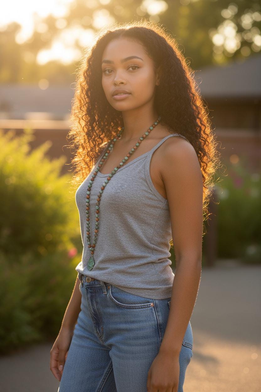 I personally design each Mala, carefully planning and laying out the bead design on a special bead board meant for 108 bead Mala’s. Every bead is hand-knotted by me for flexibility and beauty. I also create the tassels myself using Sari silk fabric, silk thread, cotton or other natural fibers. I can attach a pendant to any Mala if you choose not to have a tassel