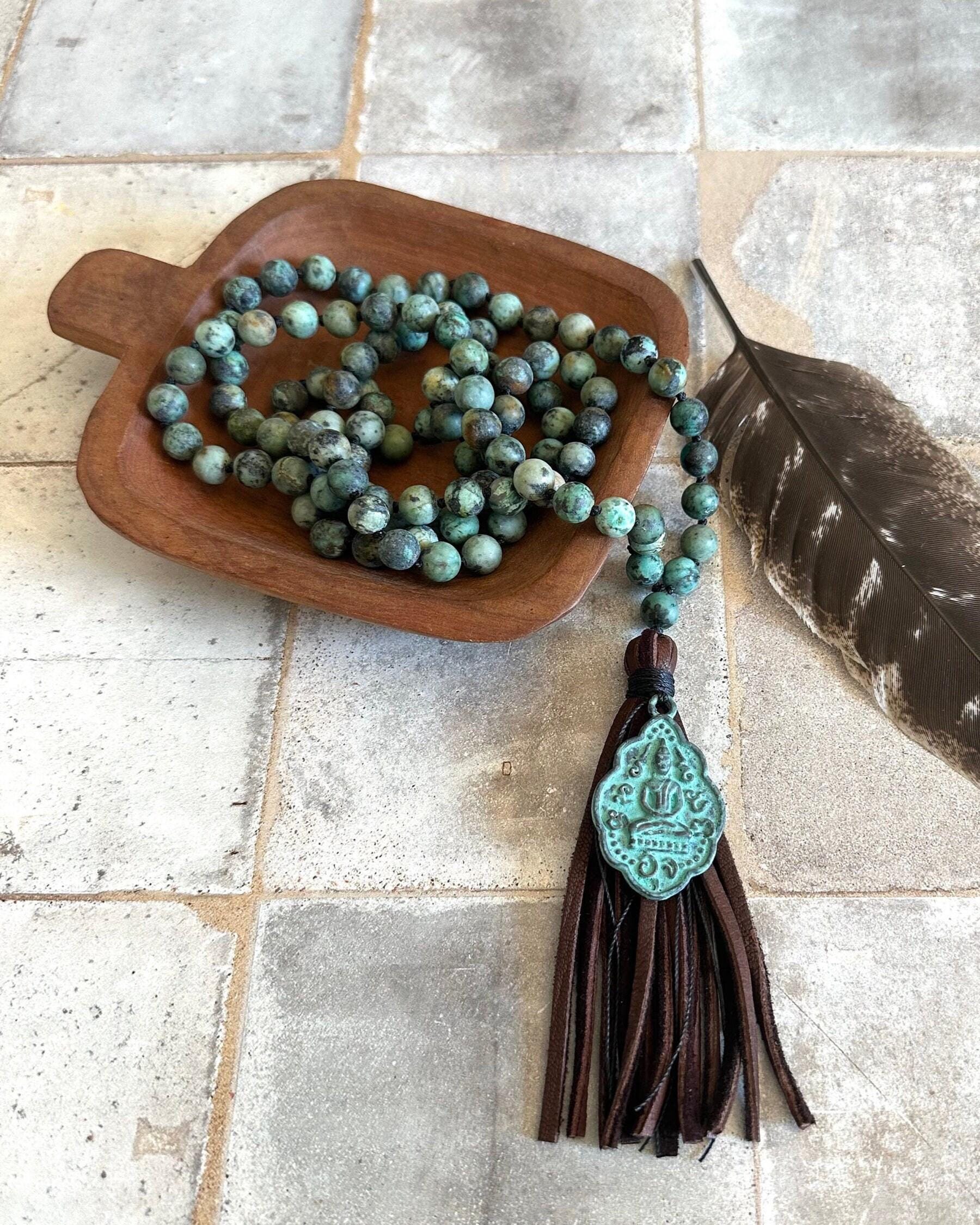 Grounded and earthy, this 108 bead Mala is hand-knotted from matte African Turquoise and finished with a brass patina Buddha pendant. It includes a leather tassel for a unique touch, with other tassel choices available for customization. African Turquoise is known as a stone of transformation and growth, encouraging balance and inner strength. Combined with the Buddha pendant, this Mala carries a sense of wisdom and grounding, making it a meaningful companion for meditation, mindfulness, or everyday wear.