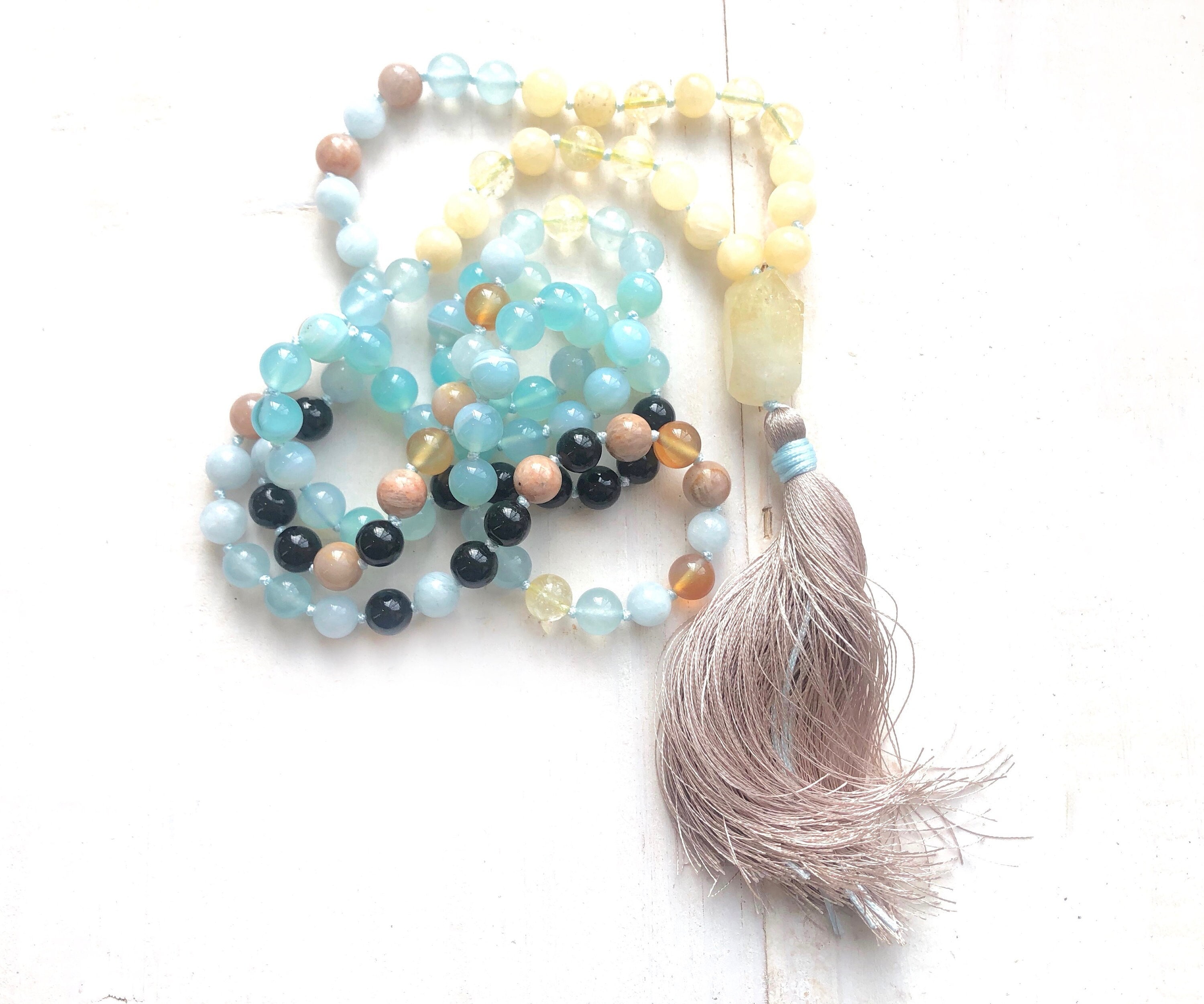 Radiant and full of color, this 108 bead Mala is hand-knotted from Yellow Jade, Aquamarine, Citrine, Aqua Striped Agate, Aqua Blue Jade, Sunstone, Carnelian, Black Tourmaline, and Black Obsidian, finished with a faceted Citrine Guru bead. Designed to capture the look of a sunset over the ocean, it is completed with a silk thread tassel and can be customized with other tassel designs of your choice. With its vibrant mix of stones—linked with joy, grounding, clarity, and renewal—this Mala is both visually striking and deeply meaningful, perfect for meditation, mindfulness, or keeping the memory of Summer with you all year long.