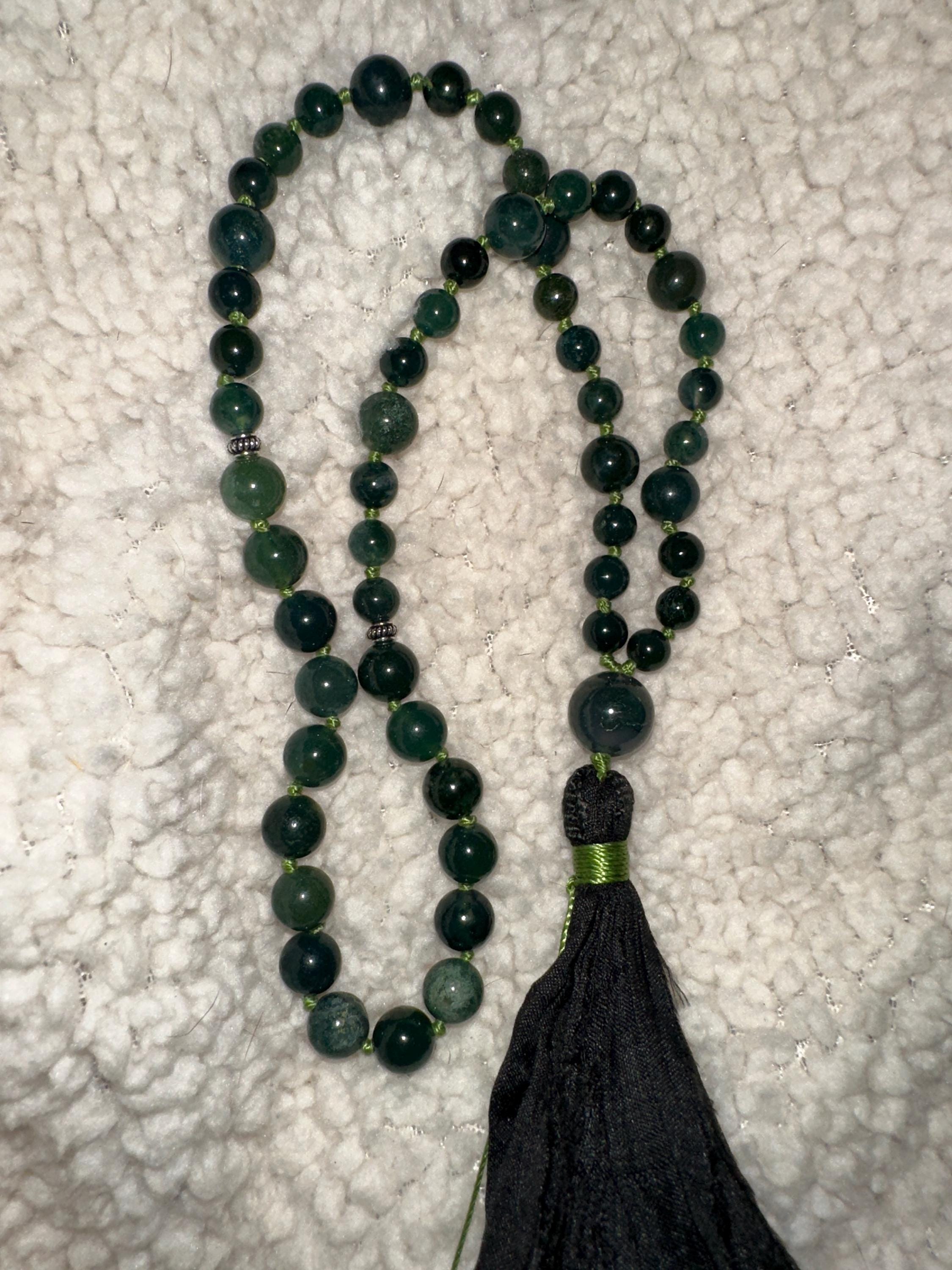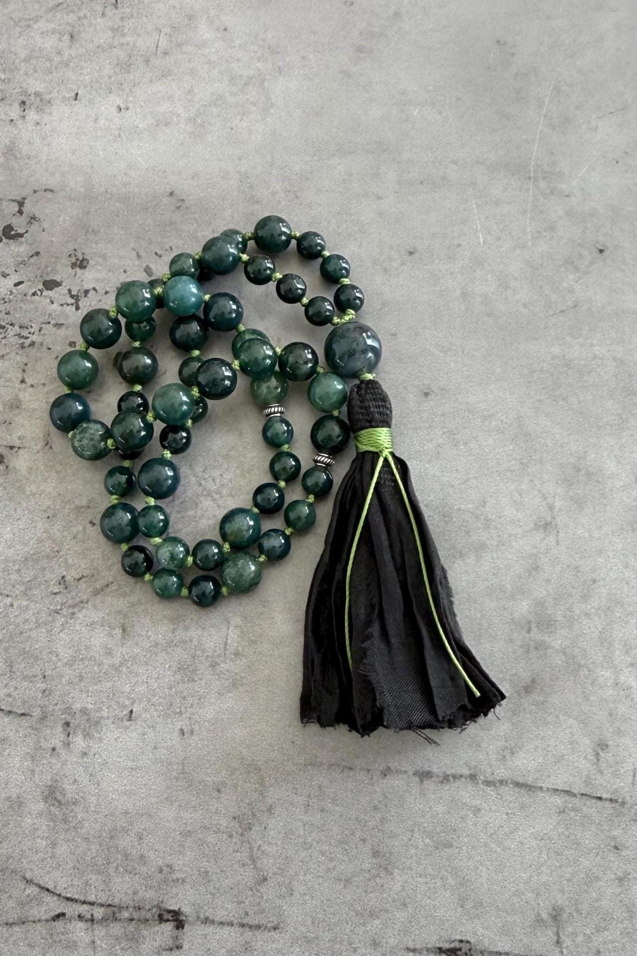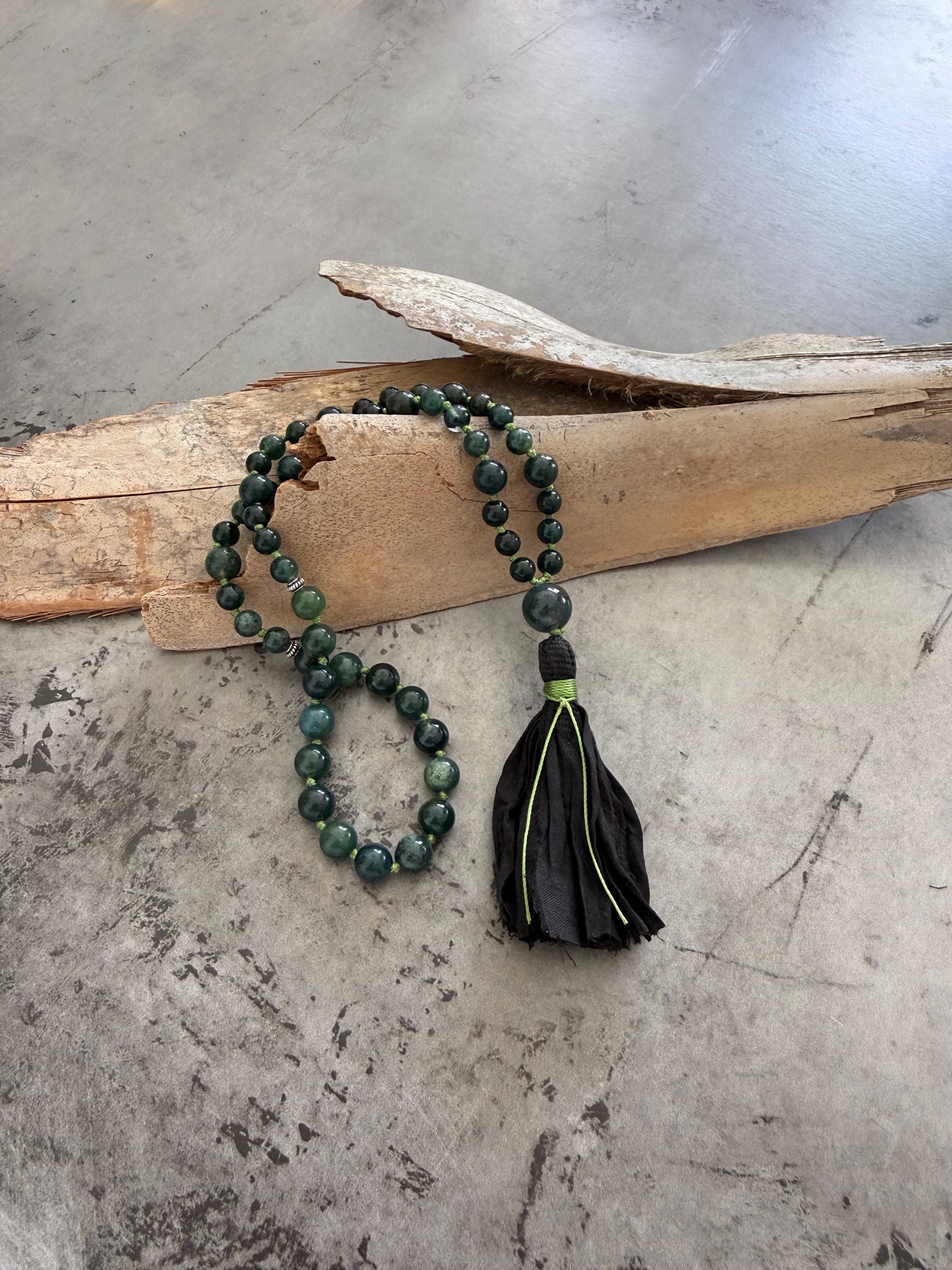 Grounding and natural, this 54-bead pocket Mala is hand-knotted from Moss Agate beads in varying sizes, creating a beautiful and organic look. It is finished with a 12mm Moss Agate Guru bead and a cotton tassel, which can be customized with different tassel types or colors. Designed to be carried in your pocket, this Mala is an excellent choice when wearing a full-size Mala isn’t possible. Perfect for travel, work, or meditation on the go, it carries the steadying energy of Moss Agate in a compact form.