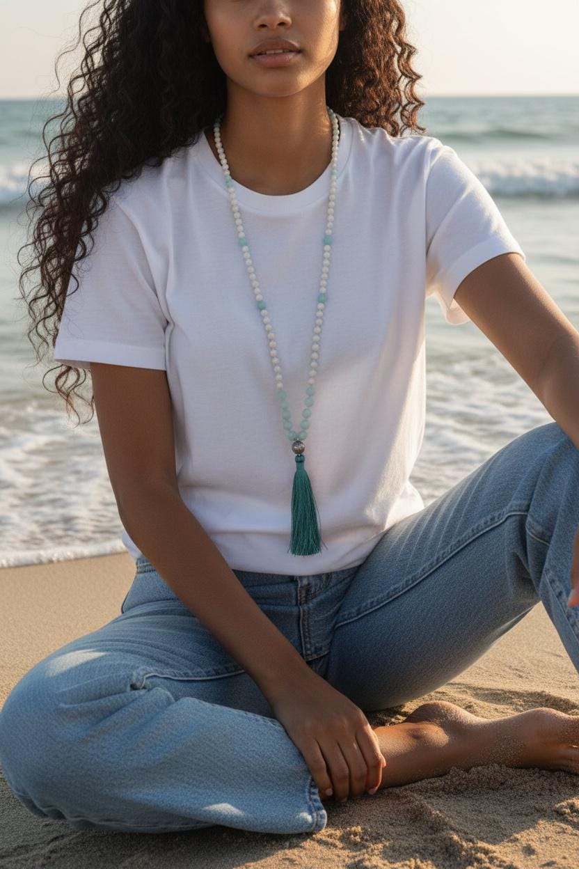 Embrace a sense of calm, balance, and grounded beauty with this handmade 108-bead Mala necklace. Riverstone’s soft, natural tones pair effortlessly with the soothing hues of Amazonite, creating a piece that feels serene and timeless. A faceted Pyrite Guru bead adds a subtle shimmer and a touch of earthy sophistication. Each bead is hand-knotted with care, giving the Mala a fluid drape and long-lasting strength. Finished with a silk thread tassel—or your choice of tassel options—this Mala is perfect for meditation, intention-setting, or wearing as a soulful accessory.