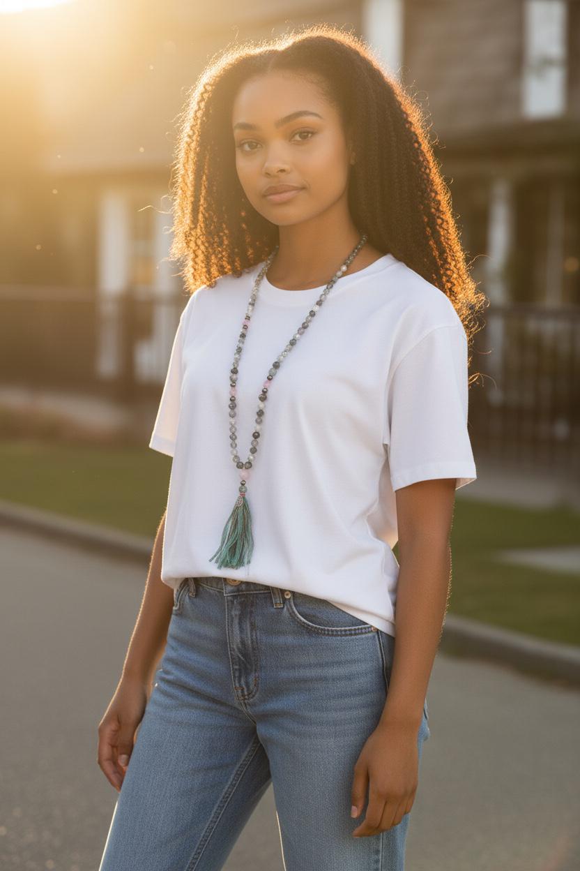 Colorful and grounding, this 108 bead Mala necklace is hand-knotted from Tree Agate, Rose Quartz, and Hematite, finished with a large round Rose Quartz Guru bead and a Green sari silk tassel, with other tassel options available. These stones are often connected with balance and love—Tree Agate is associated with growth and connection to nature, Rose Quartz with compassion and the heart, and Hematite with grounding and protection. With its fun mix of colors and customizable tassel choices, this Mala is a meaningful companion for meditation or mindfulness while wearing