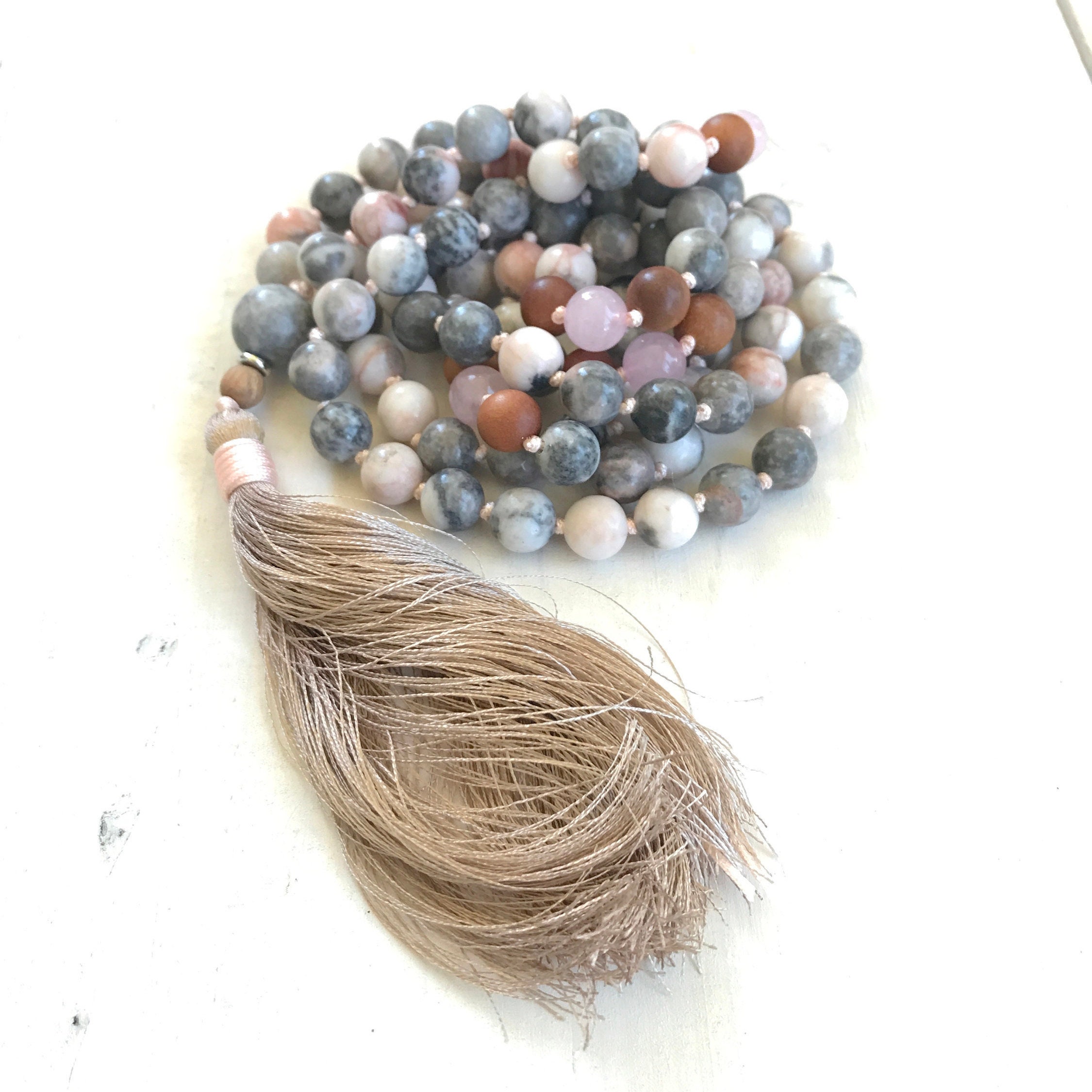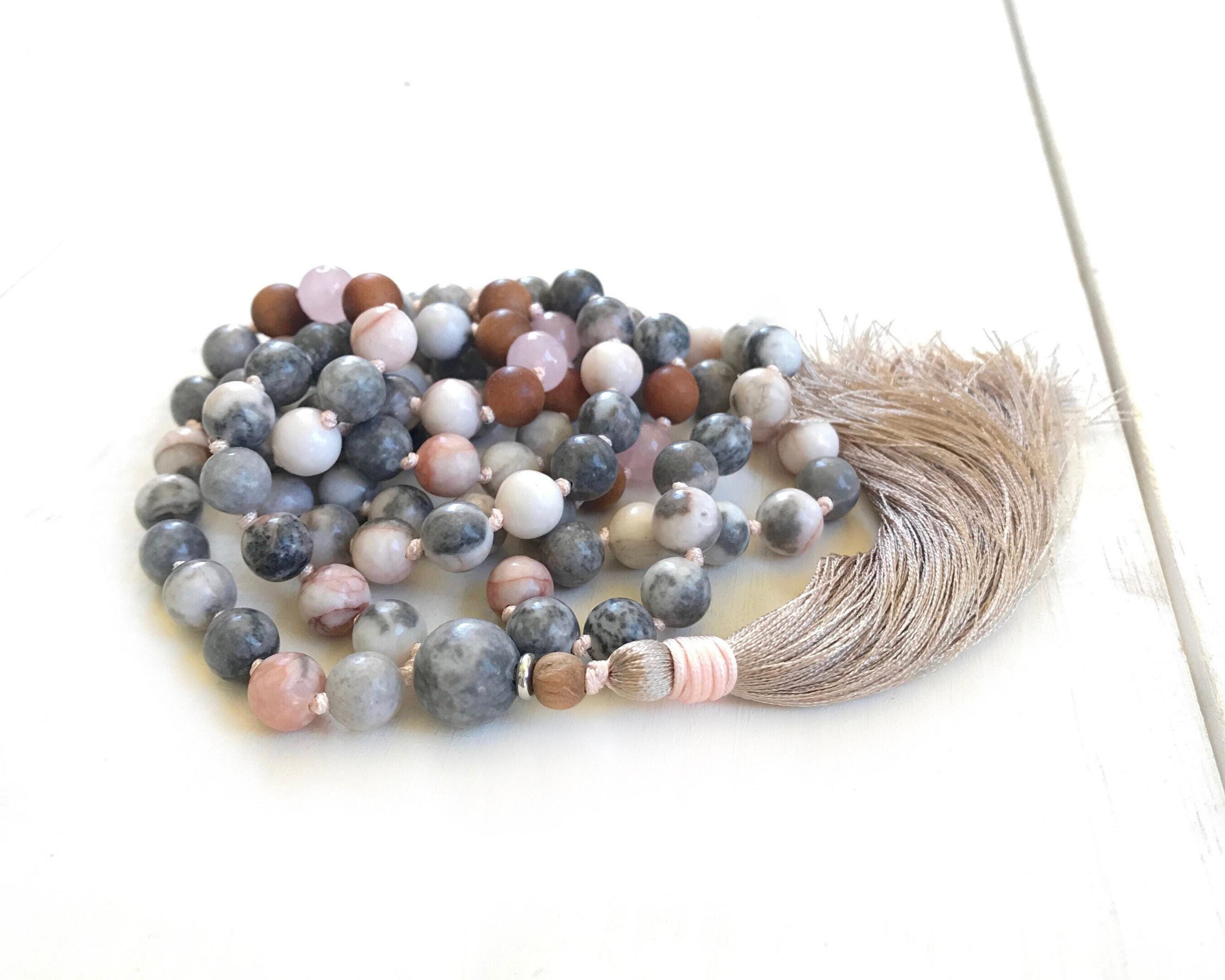 Gentle and grounding, this 108 bead Mala is hand-knotted from Pink Zebra Jasper, Rose Quartz, and Sandalwood, finished with a Pink Zebra Jasper Guru bead. It is completed with a silk thread tassel, with other tassel choices available for personalization. Pink Zebra Jasper is often connected with balance and stability, Rose Quartz with love and compassion, and Sandalwood with calm and clarity. Together, they create a soothing and supportive Mala, perfect for meditation, mindfulness, or as a meaningful accessory.