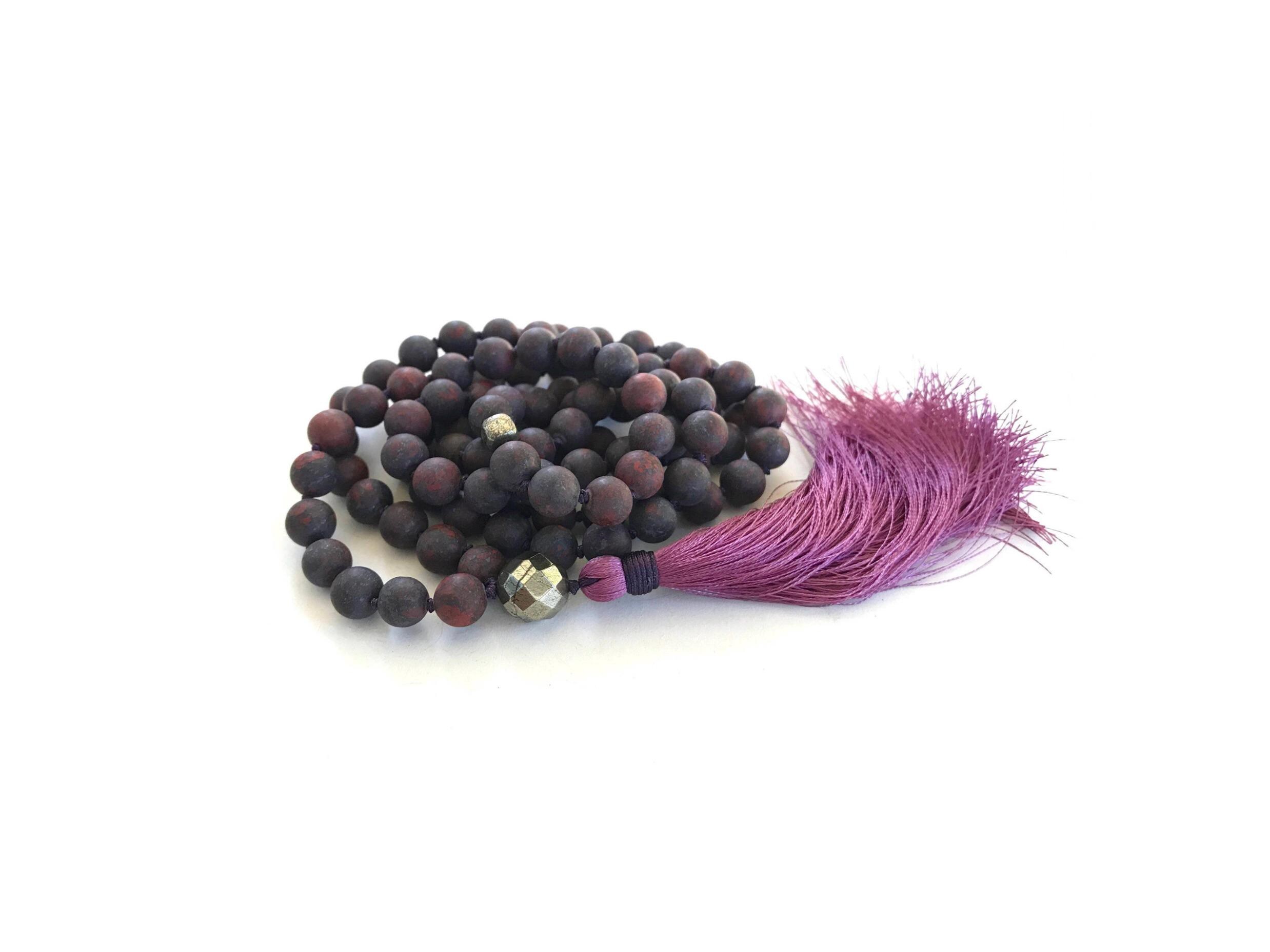 Bold and grounding, this 108 bead Mala is hand-knotted from matte Red Brecciated Jasper and Pyrite, finished with a faceted Pyrite Guru bead. It is completed with a silk thread tassel, with other tassel choices available for customization. Red Brecciated Jasper is often connected with strength and stability, while Pyrite is associated with protection and confidence. Together, they create a powerful and supportive Mala, perfect for meditation, mindfulness, or a unique gift.