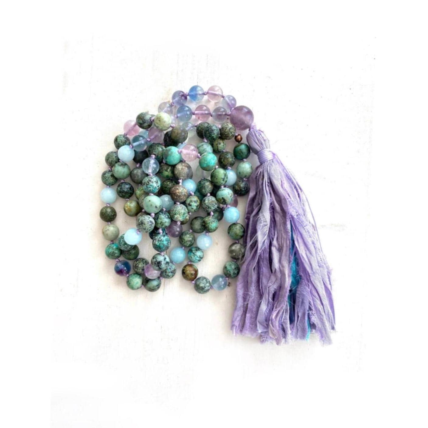 Calming and colorful, this 108 bead Mala necklace is hand-knotted from African Turquoise, faceted Amazonite, and Purple Fluorite, finished with a Purple Fluorite Guru bead and a Sari silk tassel in shades of Purple with a splash of Blue. These stones are often connected with growth and peace—African Turquoise is associated with transformation and balance, Amazonite with harmony and soothing energy, and Fluorite with clarity and spiritual focus. With its beautiful mix of calming colors, this Mala is a meaningful choice for meditation, or daily mindfulness while wearing. A variety of different tassels can be added, you choose the look you like best.