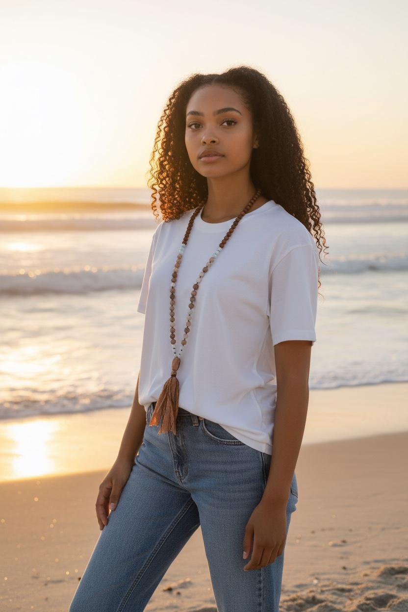 My Malas are available in two sizes: 8mm and 6mm. If you like a lighter or more petite style, the 6mm is a great choice. Each listing shows the Mala on a mannequin and a model so you can get a clear idea of how it looks. If you need guidance, just send me a note—I’m happy to help.