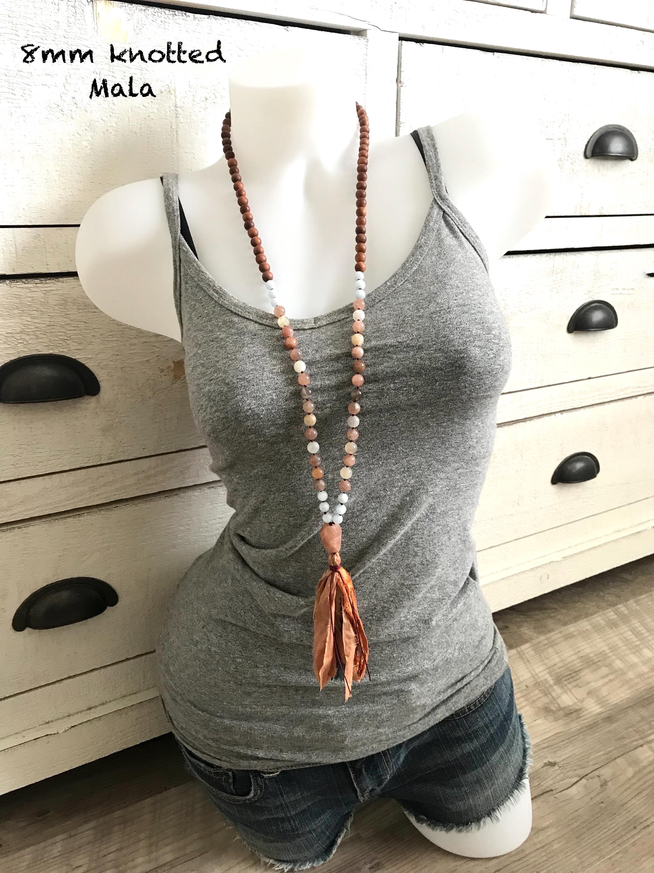 I personally design each Mala, carefully planning and laying out the bead design on a special bead board meant for 108 bead Mala’s. Every bead is hand-knotted by me for flexibility and beauty. I also create the tassels myself using Sari silk fabric, silk thread, cotton or other natural fibers. I can attach a pendant to any Mala if you choose not to have a tassel