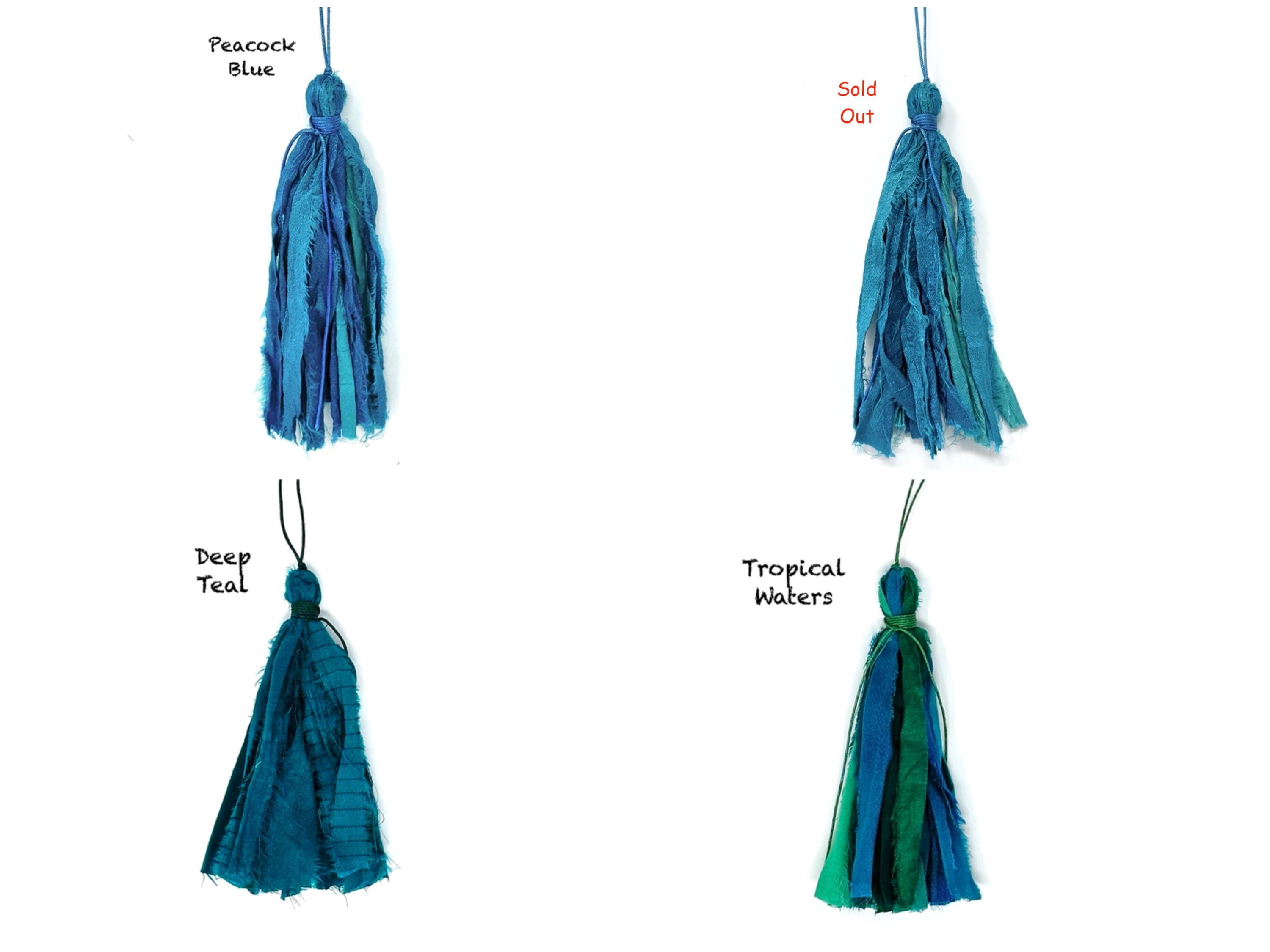 Bring calming, soothing, and spiritually uplifting energy to your creations with these handmade Turquoise Sari Silk Tassels. Each tassel is crafted from recycled sari silk fabric remnants from India, offering soft texture, fluid movement, and naturally varied depth of color. These tassels measure approximately 4" long (not including your chosen attachment), and because each one is handmade, you may request adjustments to length, fullness, or cord color to perfectly fit your project.