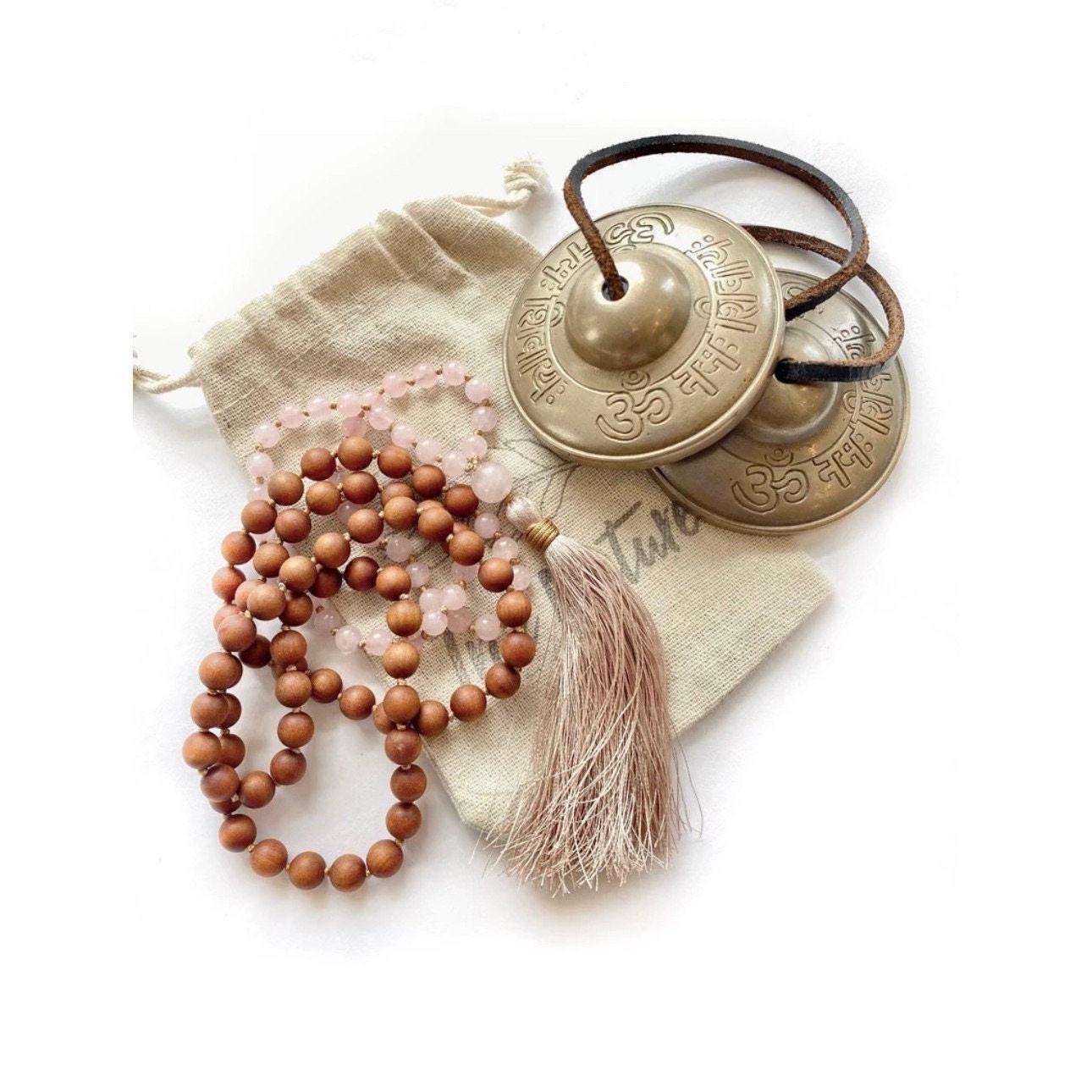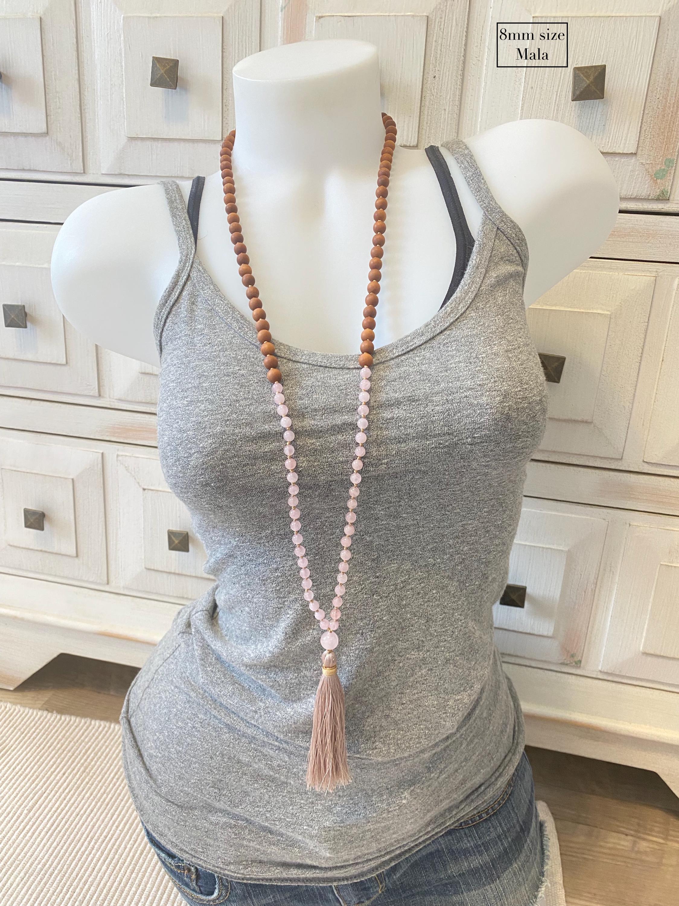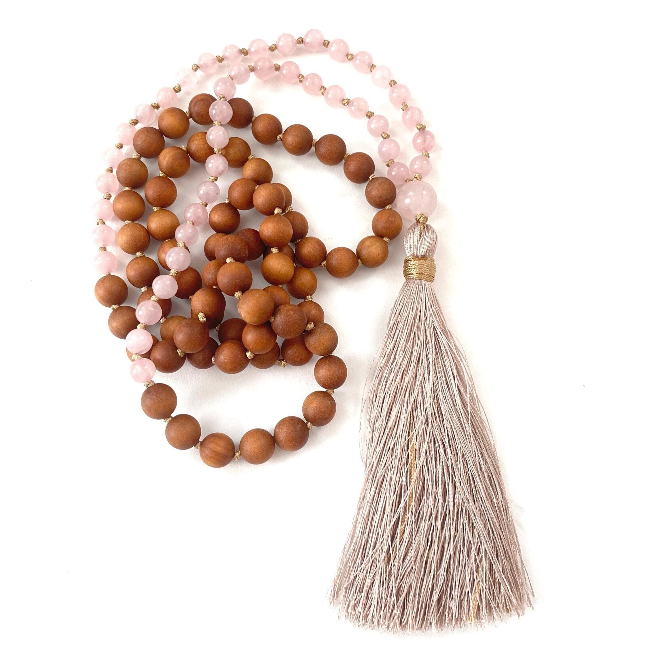 Simple and soothing, this 108 bead Mala is hand-knotted from Sandalwood and Rose Quartz, finished with a Rose Quartz Guru bead. It is completed with a silk thread tassel, with other tassel options available, including a no-tassel option for an on-the-go style or to wrap comfortably around your wrist. Sandalwood is often connected with calm and clarity, while Rose Quartz is associated with love and compassion, making this Mala a versatile and meaningful choice for meditation, mindfulness, or everyday wear.