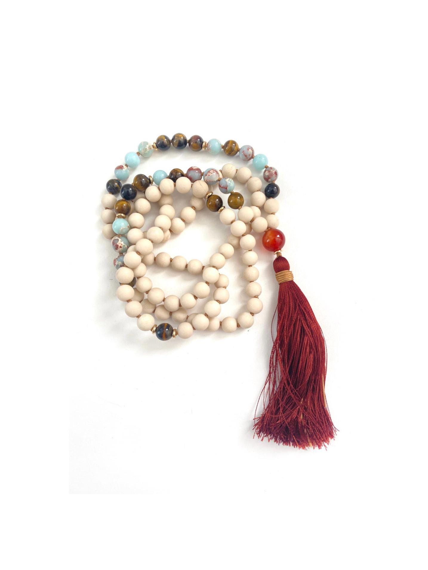 Earthy and vibrant, this 108 bead Mala necklace is hand-knotted from matte Riverstone, Tiger Eye, and Aqua Terra Jasper, accented with gold metal spacers throughout. It is finished with a large Carnelian Guru bead and a silk thread tassel, with other tassel choices available. These stones are often connected with balance and vitality—Riverstone is associated with renewal and clarity, Tiger Eye with strength and confidence, Aqua Terra Jasper with peace and grounding, and Carnelian with energy and creativity. Unique and meaningful, this Mala is a beautiful choice for meditation, mindfulness, or giving as a special gift