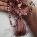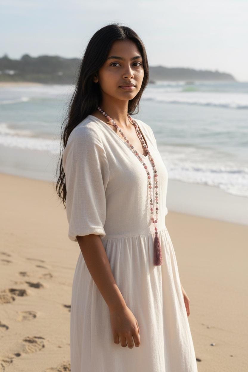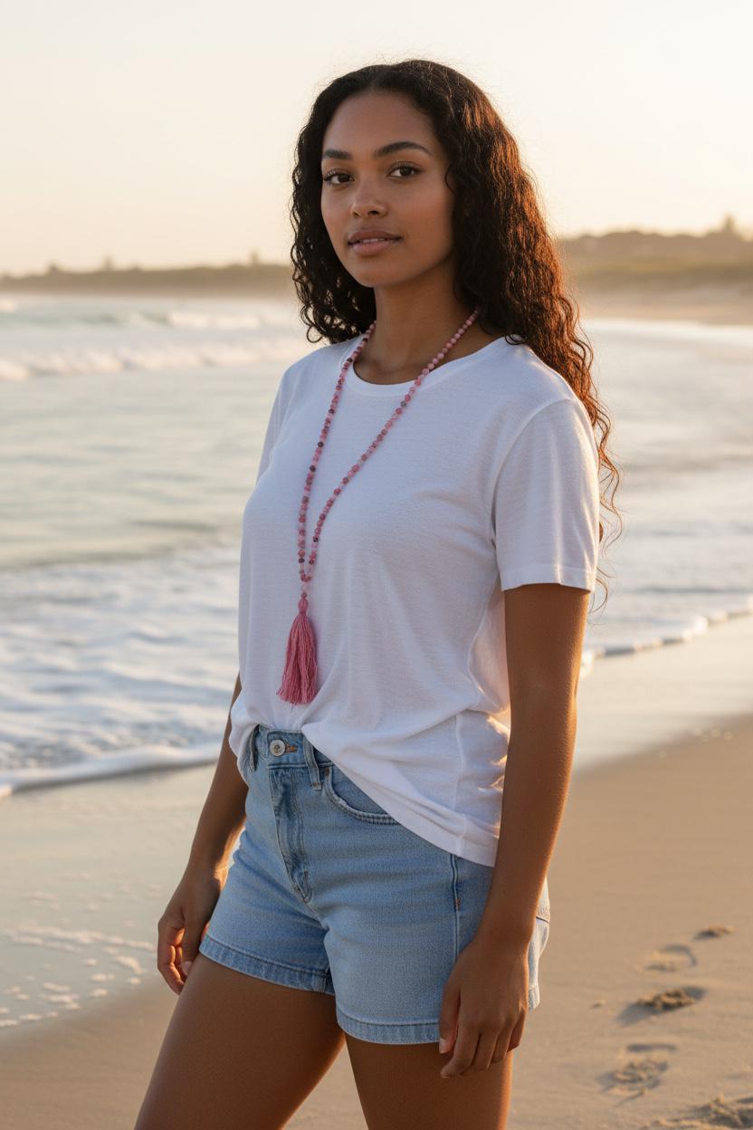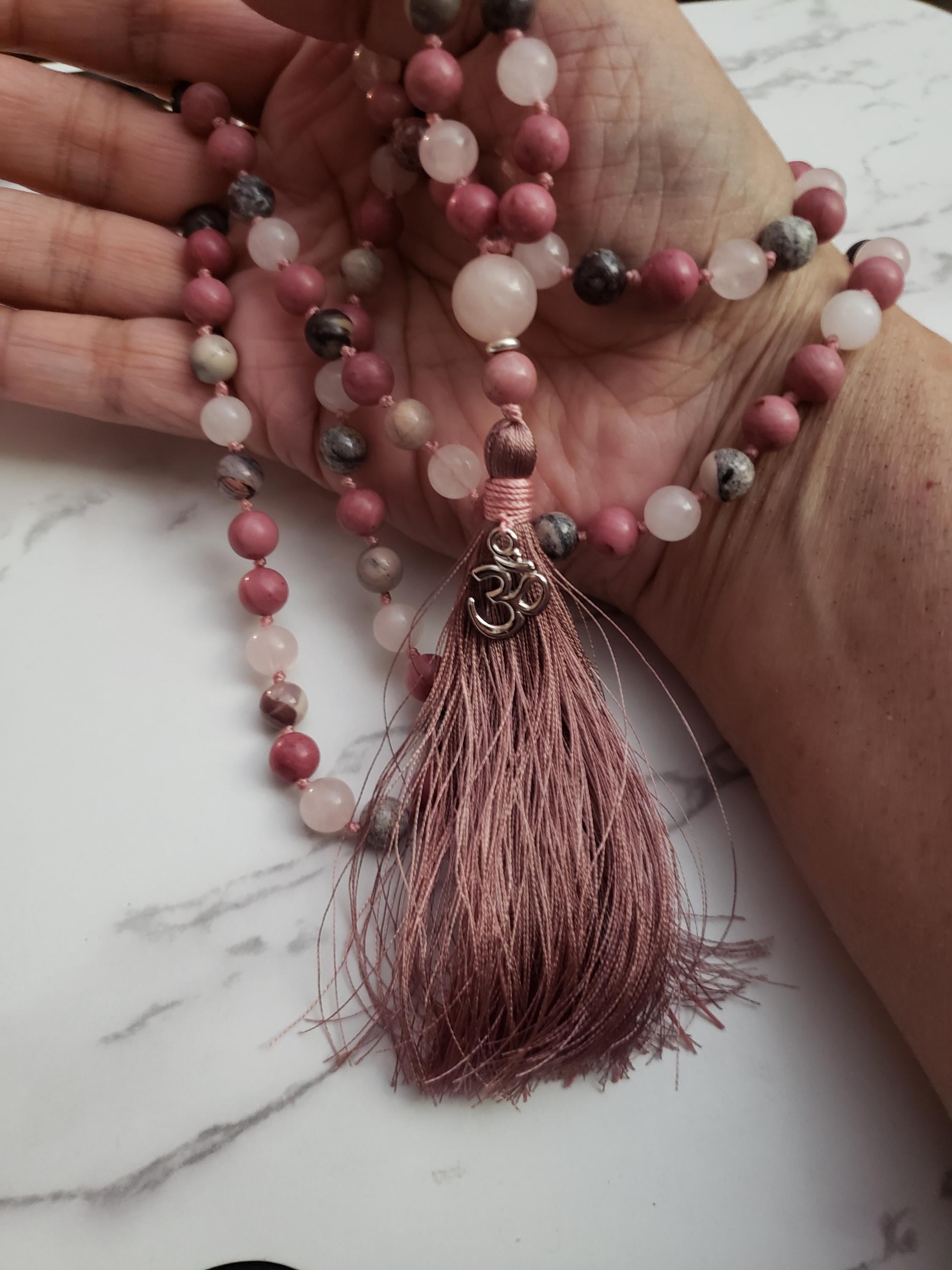 Soothing and heartfelt, this 108 bead Mala necklace is hand-knotted from Porcelain Jasper, Rose Quartz, and Rhodonite, finished with a large Rose Quartz Guru bead and Sari silk tassel. These stones are often connected with love and emotional balance—Porcelain Jasper is associated with comfort and healing, Rose Quartz with compassion and self-love, and Rhodonite with forgiveness and harmony. Gentle yet powerful, this Mala is a beautiful choice for meditation, mindfulness, or to wear daily. A variety of different tassel choices are available, you choose the look you like best